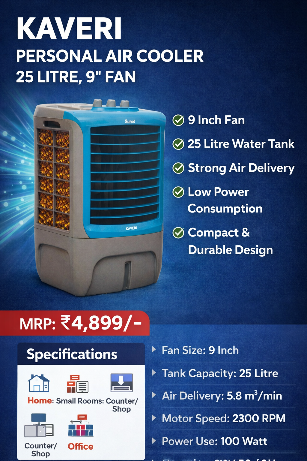KAVERI Personal Air Cooler powerful cooling ke saath aata hai, jo har tarah ke spaces ke liye perfect hai—chaahe wo aapka ghar ho, office ho ya fir shop. Garmiyon ke mosam me bhi cool aur comfortable feel ke liye iska istamaal karein.