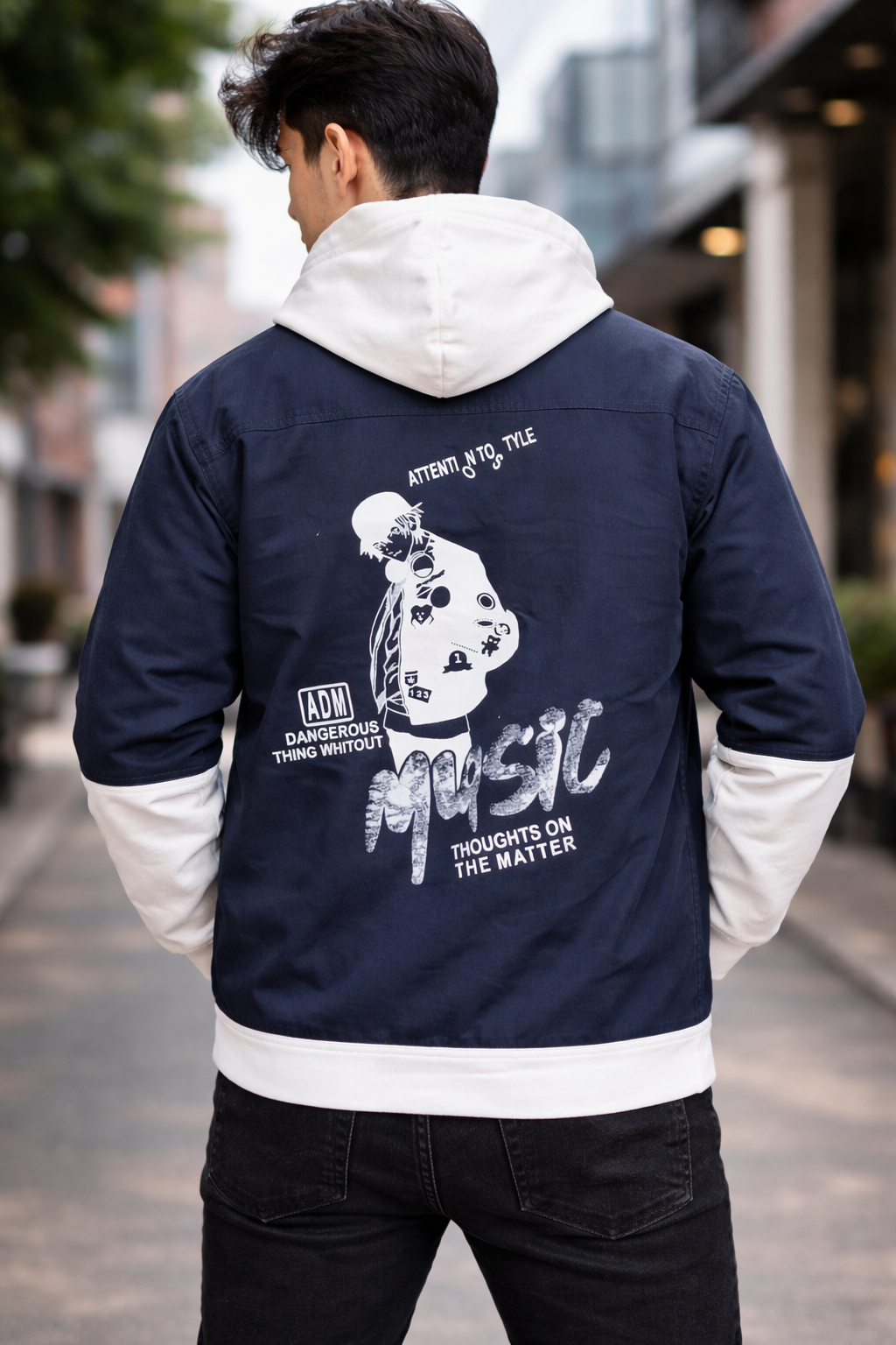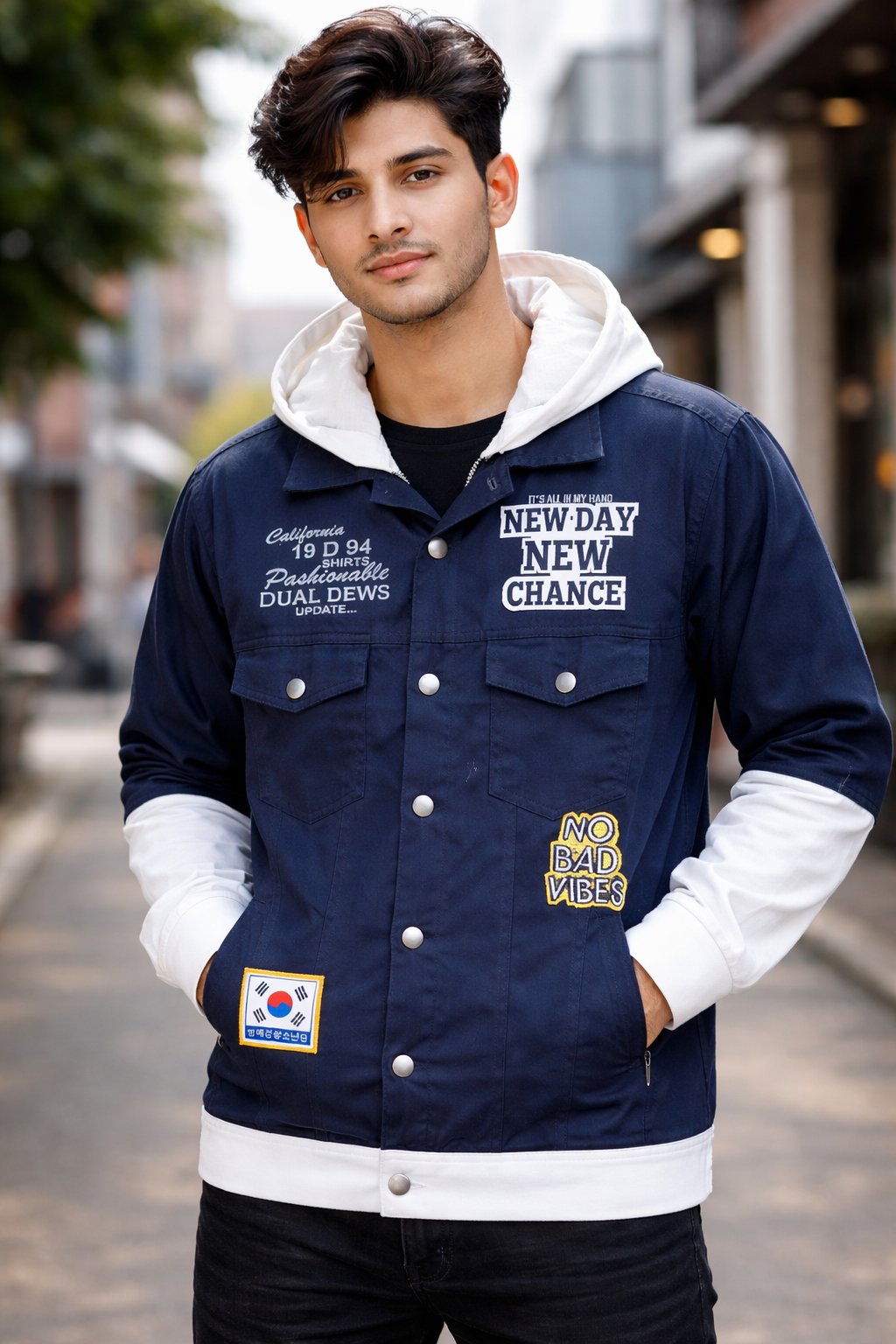 • Men’s Navy Blue Hooded Jacket with Printed Design