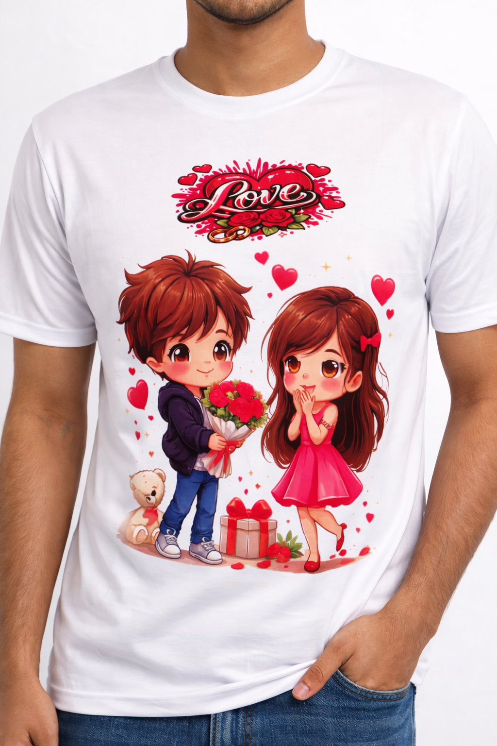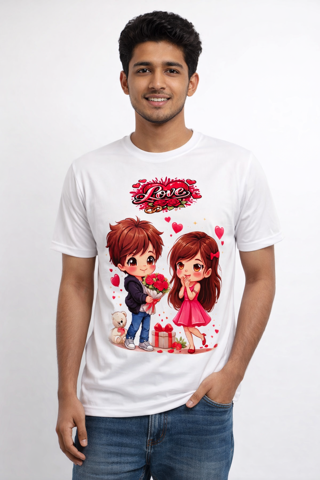 This stylish men’s T-shirt features an attractive love cartoon design that adds a fun and romantic touch to your outfit. Made from soft and breathable fabric, it offers all-day comfort and a modern casual look. Ideal for young men, gifting, and special occasions like Valentine’s Day.