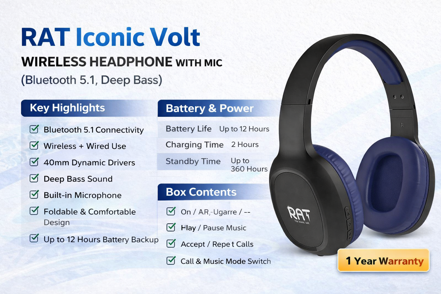 Introducing the RAT Iconic Volt Light Purple Headphone – a perfect blend of style and performance. Designed to provide a premium audio experience, it features Bluetooth 5.1 technology for seamless connectivity and reliable performance.